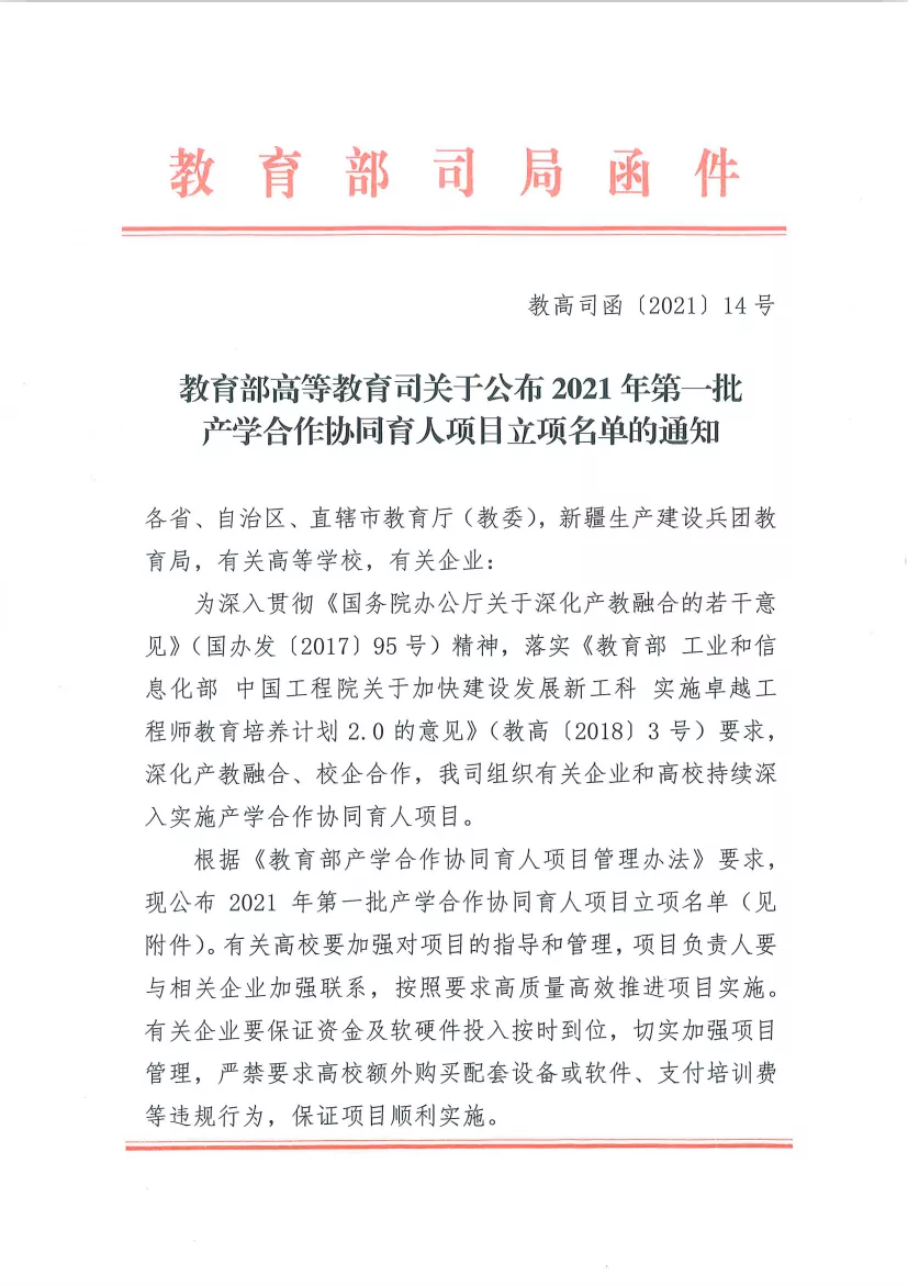 日前,《教育部高等教育司關(guān)于公布2021年第一批產(chǎn)學(xué)合作協(xié)同育人項目立項名單的通知》正式發(fā)布。