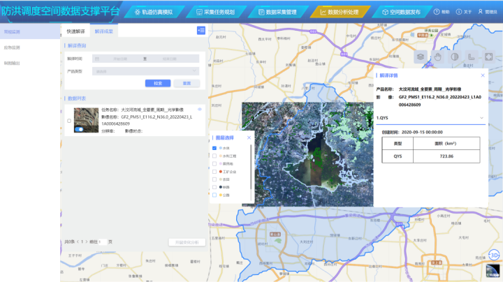 蒼穹數(shù)碼主導(dǎo)開(kāi)發(fā)的防洪重點(diǎn)保護(hù)對(duì)象動(dòng)態(tài)監(jiān)測(cè)模塊通過(guò)遙感技術(shù)監(jiān)測(cè)大汶河以及沂沭河流域內(nèi)的防洪重點(diǎn)保護(hù)對(duì)象,界定重點(diǎn)保護(hù)對(duì)象范圍,采用遙感影像信息提取技術(shù)或者基于采購(gòu)的高時(shí)效性數(shù)據(jù)產(chǎn)品的方式,提取受洪水威脅的居民地、骨干交通(重要鐵路及公路干線(xiàn))、工礦企業(yè)(大型骨干企業(yè)和工礦區(qū))、重要水利工程、農(nóng)田等作為防洪重點(diǎn)保護(hù)對(duì)象的空間范圍。