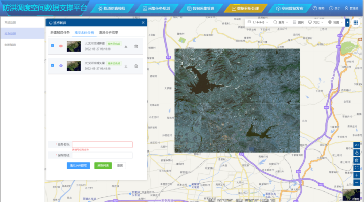 本功能通過(guò)判斷閾值的水指數(shù)算法開(kāi)發(fā)了水體提取模型,利用SAR影像提取防洪重點(diǎn)區(qū)域的水體信息,并通過(guò)判對(duì)比分析不同時(shí)期的水體邊界范圍,提取水體的淹沒(méi)范圍,為汛期的防洪應(yīng)急監(jiān)測(cè)提供數(shù)據(jù)支撐。